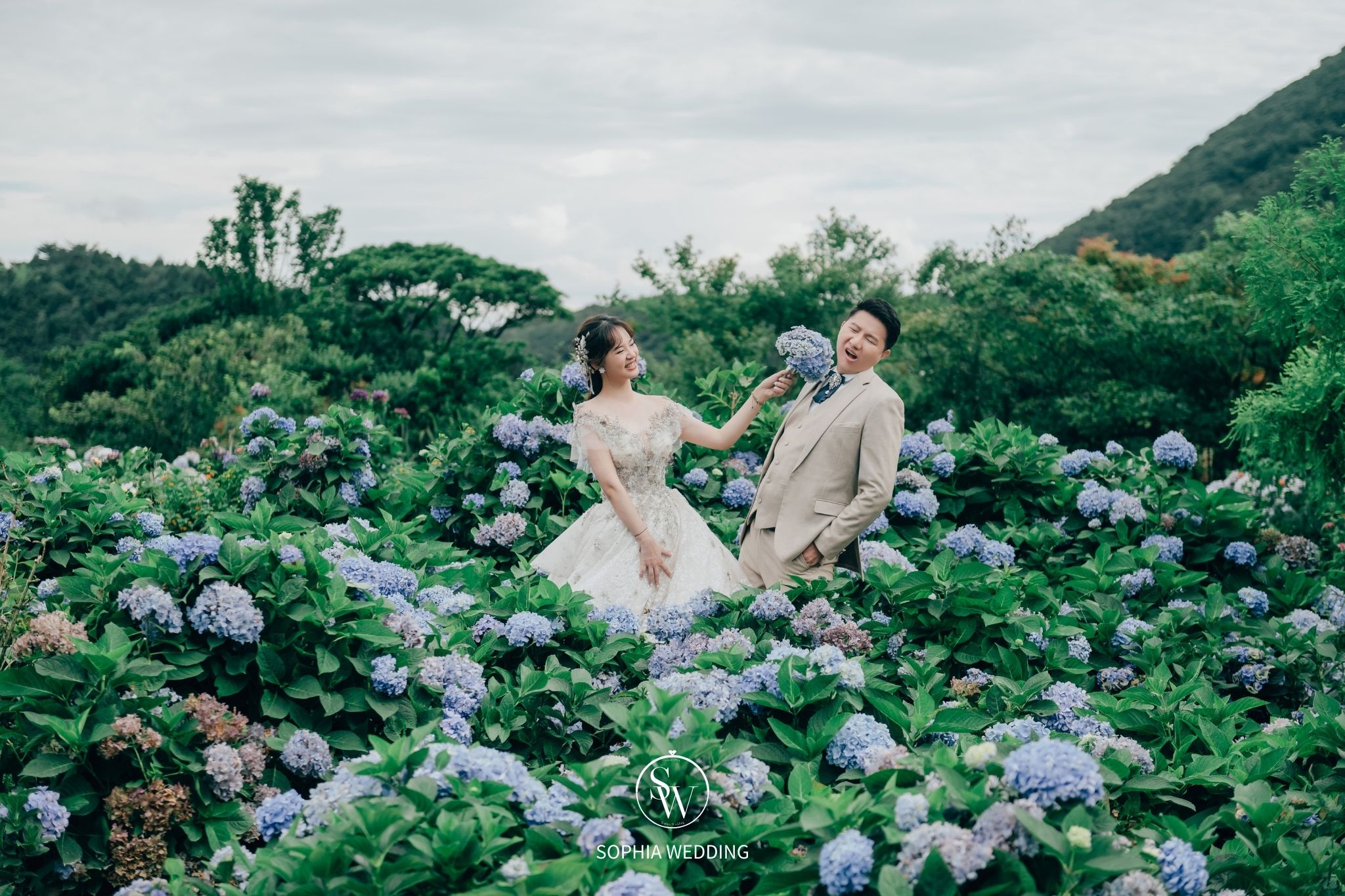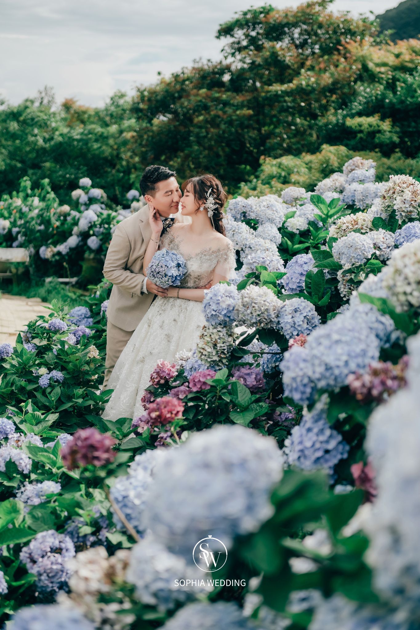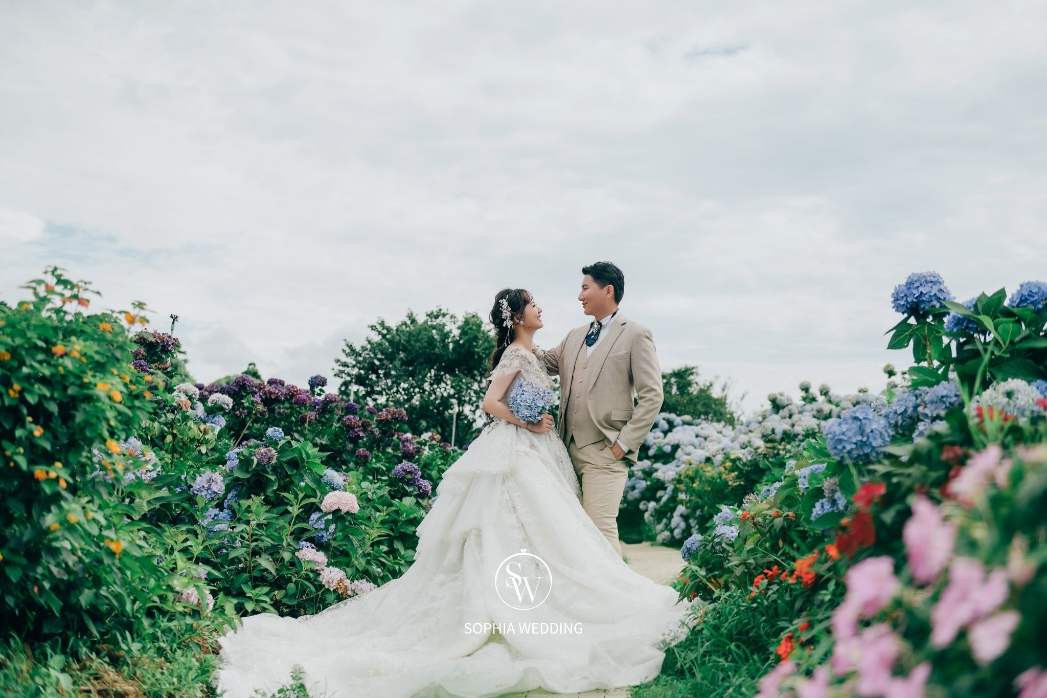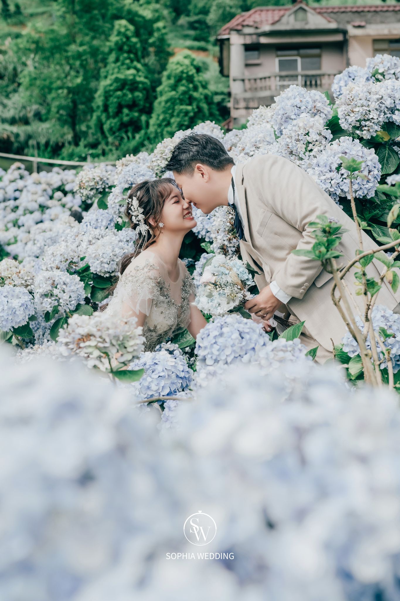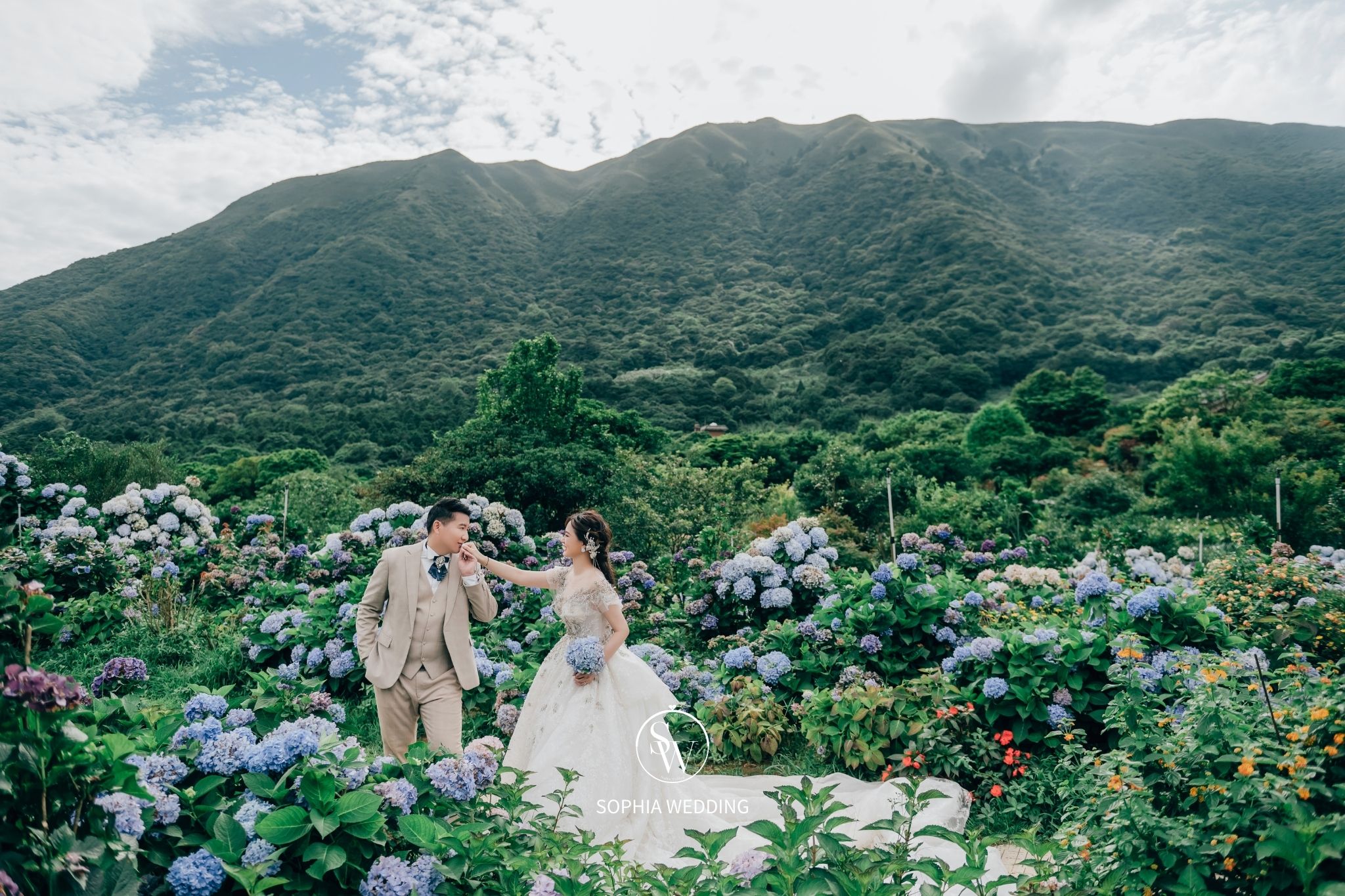 為婚紗照增添了自然優雅的氛圍。攝影師和新人都喜愛在此拍攝,捕捉滿佈繡球花的浪漫畫面。