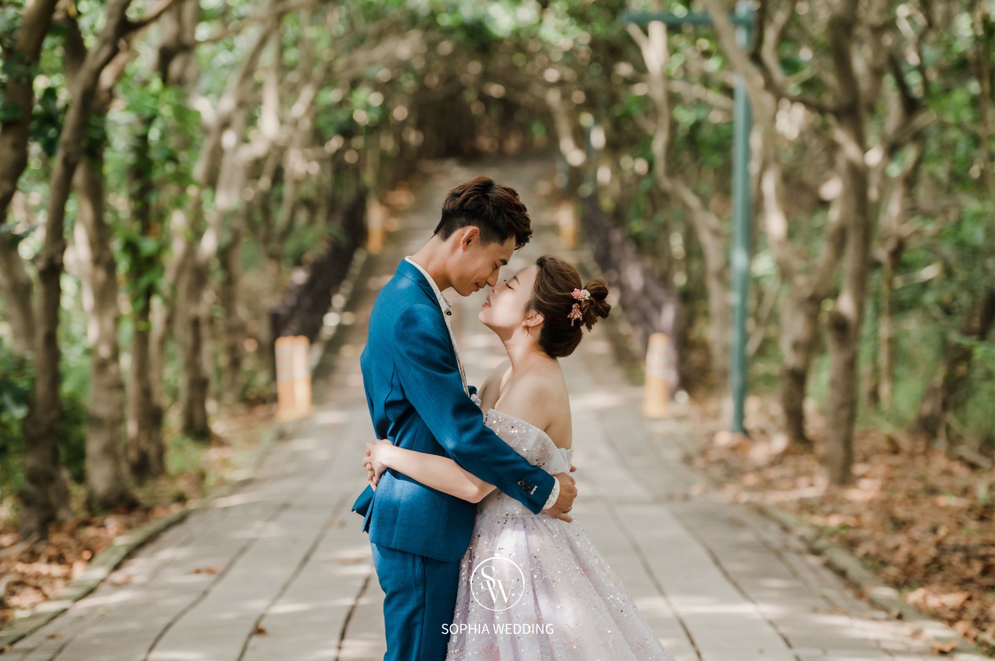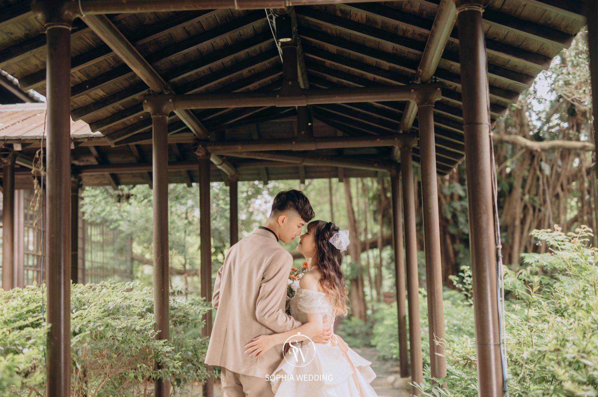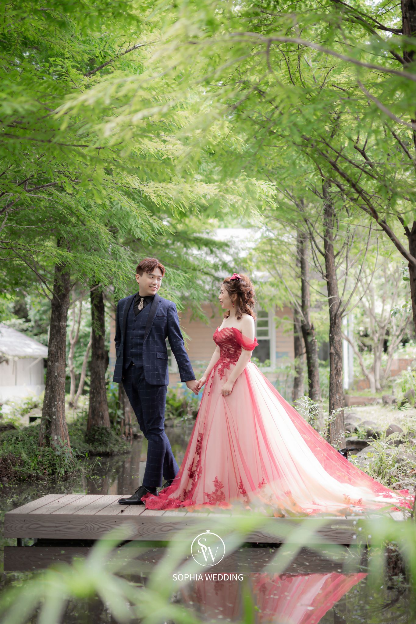 溪流和優雅的小徑,為新人營造了一個浪漫自然的拍攝環境。專業攝影師能捕捉到新人在這片綠意盎然的樹林中,