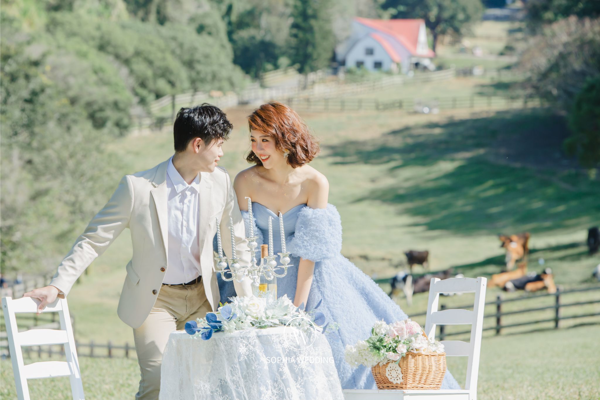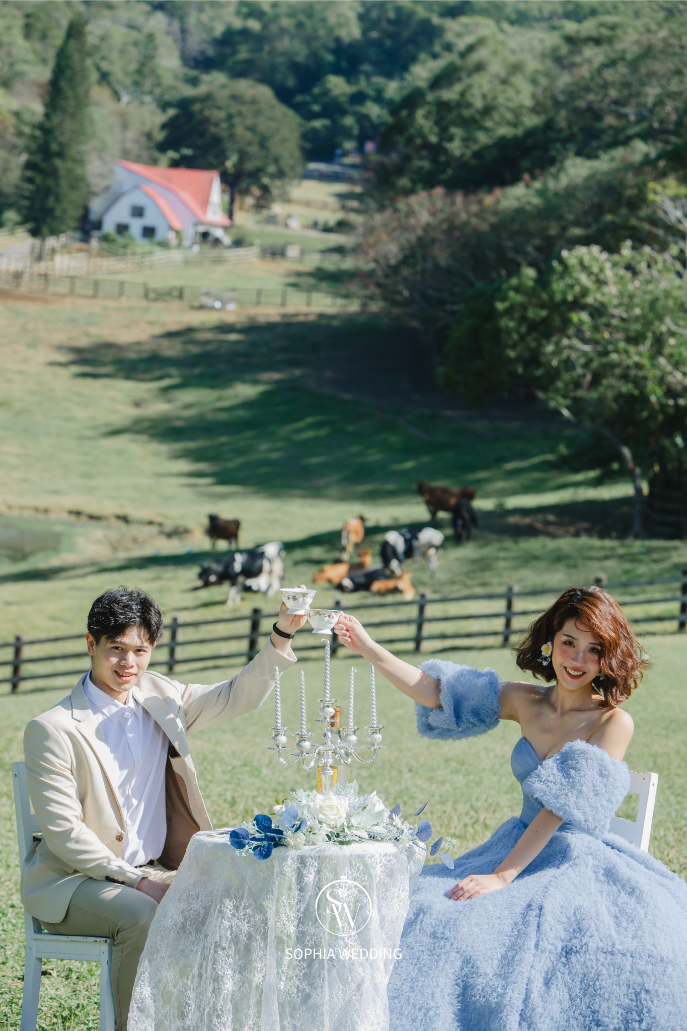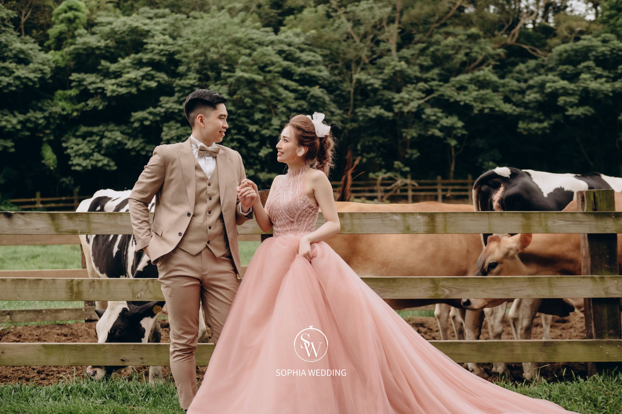 牧場風景如畫,擁有廣闊的草原、小木屋、以及可愛的奶牛等,為拍攝婚紗照營造了夢幻般的氛圍。